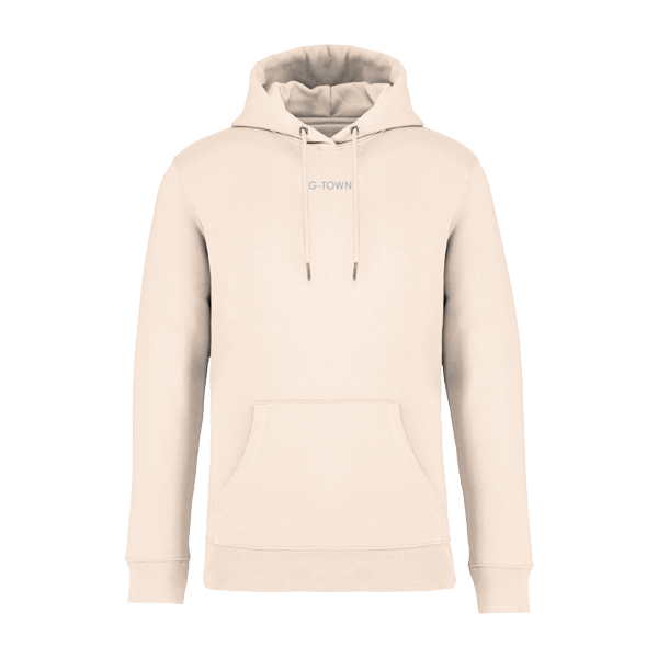 De duurzame ivoorkleurige heren hoodie met zilveren detail van G-TOWN combineert tijdloze eenvoud met urban flair. Gemaakt van biologisch katoen en gerecycled polyester, met een relaxed fit en subtiele zilveren branding. Perfect voor streetwear, loungewear en alles daartussenin.