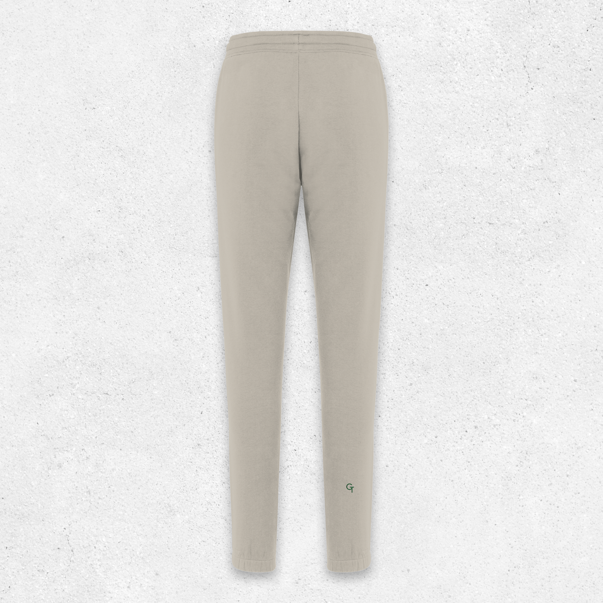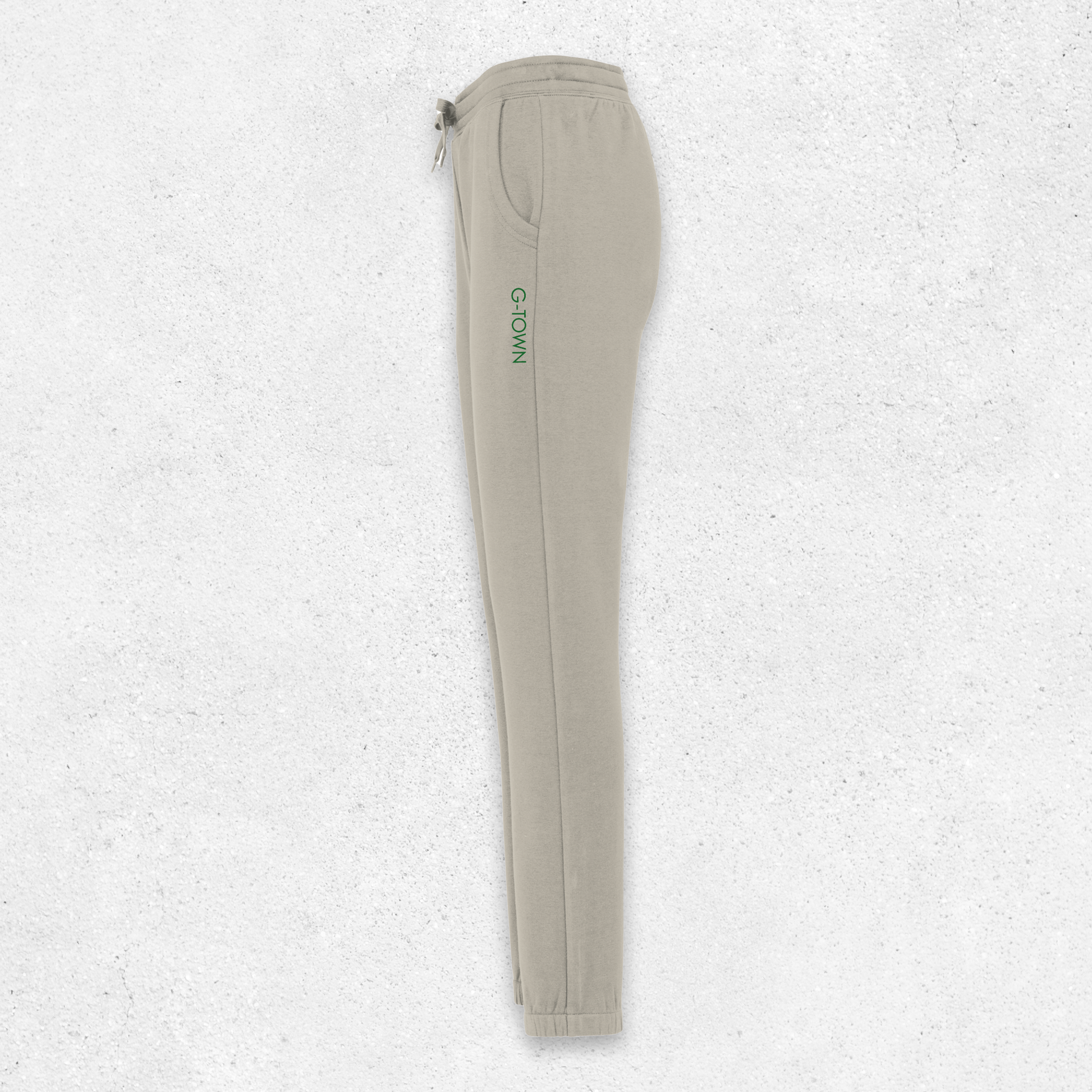 Op de rechterkuit vind je het GT-logo in groen, als visuele echo van beweging. Op het linker bovenbeen, net onder de zak, staat de merknaam G-TOWN verticaal gedrukt in groen subtiel, maar uitgesproken. Dit is geen loungebroek. Dit is een visuele herinnering aan waar je vandaan komt en waar je naartoe gaat.