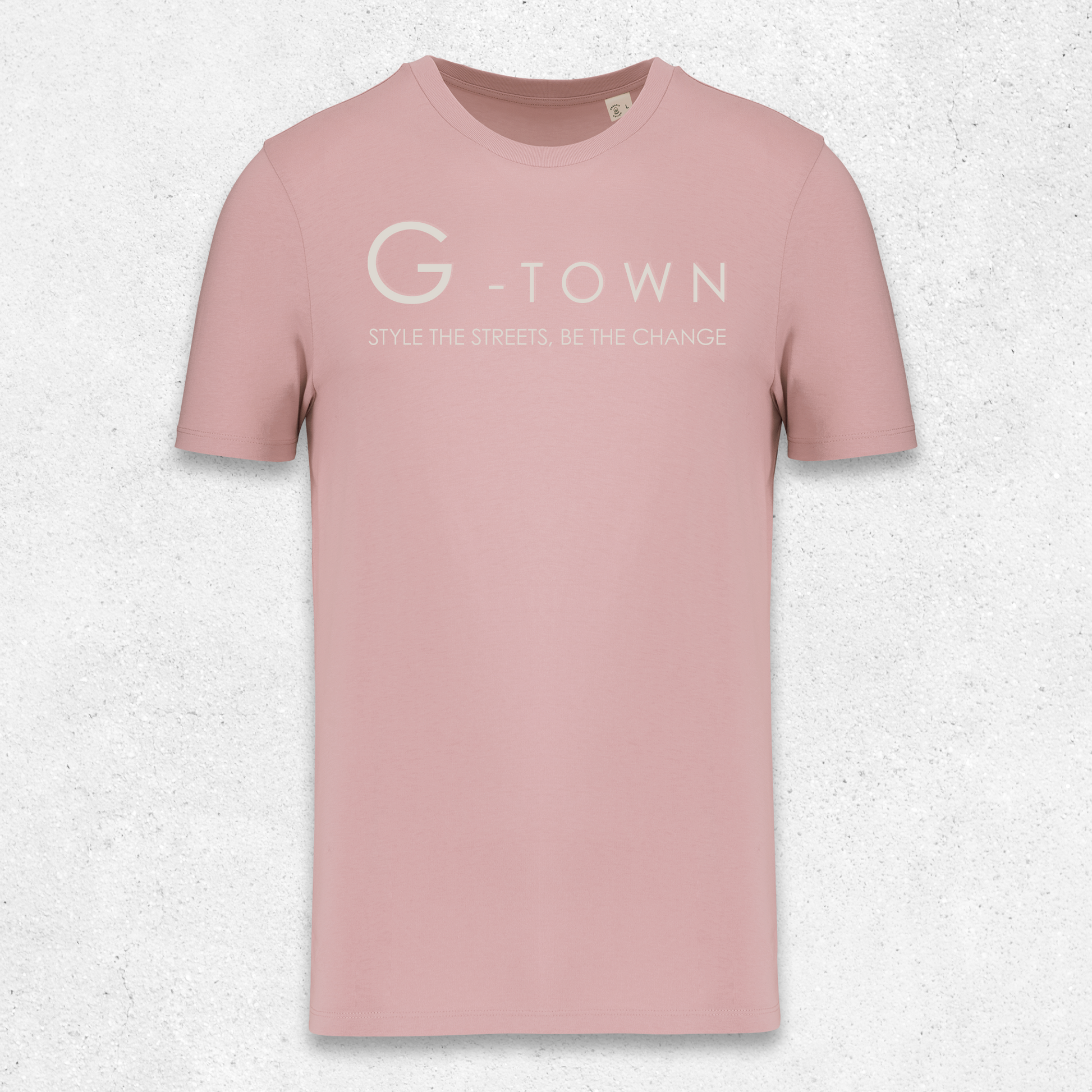 De G-TOWN Re-Form Tee is een heren streetwear T-shirt van 100% biologisch katoen, uitgevoerd in een zachte blush pink tint met een typografische frontprint in wit. Het woord G-TOWN staat centraal op de borst, waarbij de ‘G’ net iets groter is dan de rest een subtiele visuele shift die kracht en richting symboliseert. Daaronder staat: Style the streets. Be the change.
